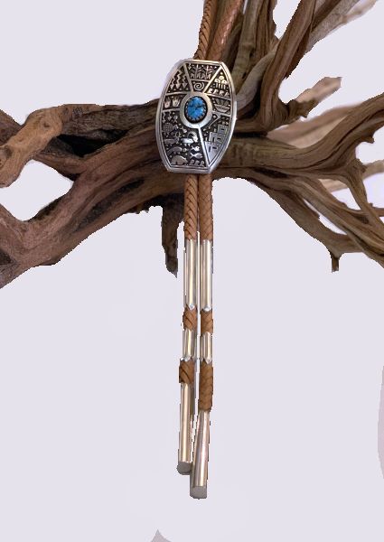 1516 Bolo by Santo Domingo artist Joseph Coriz. The 2” x 3” bolo has a pueblo scene, corn, harvest basket and animals. Eighteen karat gold dots are sprinkled throughout. A 3/8” x 1/2” Kingman cabochon is in the center, encased by a 14 karat gold bezel. The bolo is on 40” tan hand braided leather. Three piece sterling silver tips compliment the bolo.
