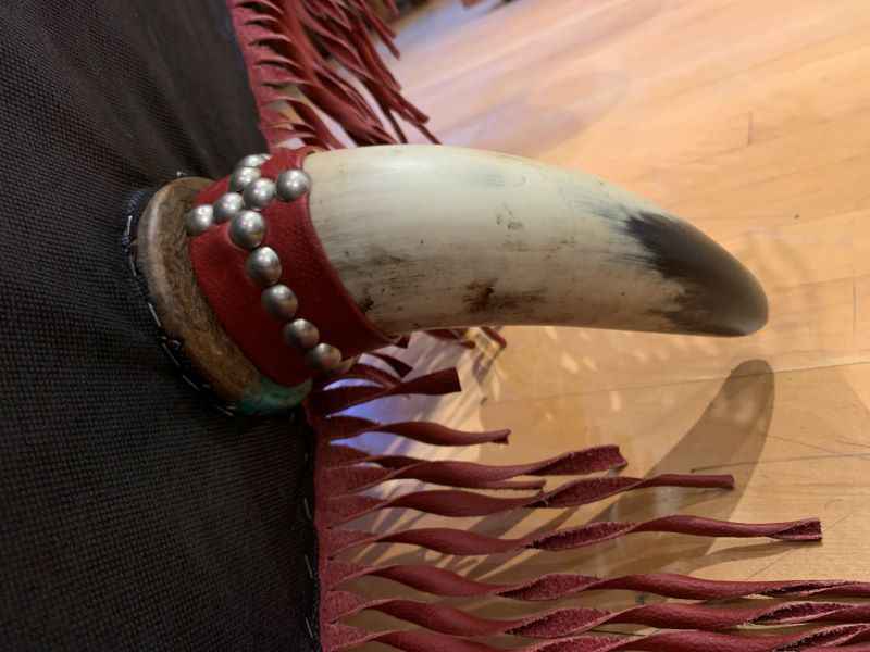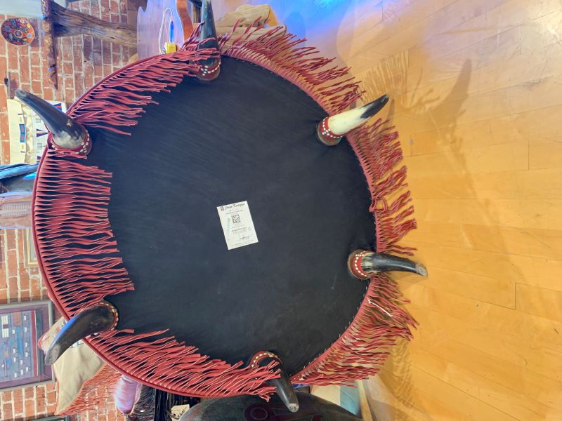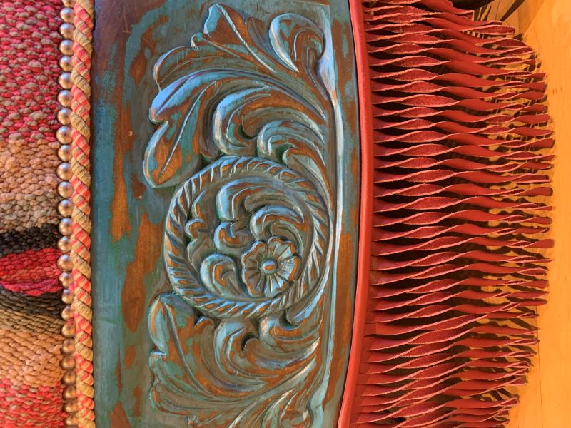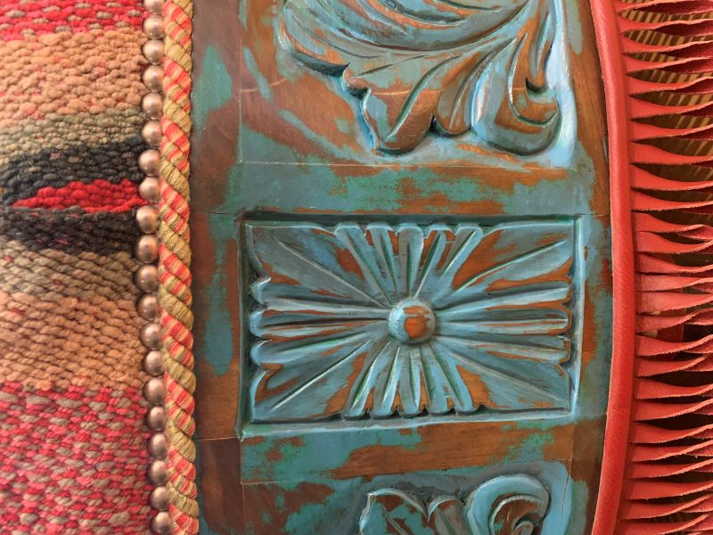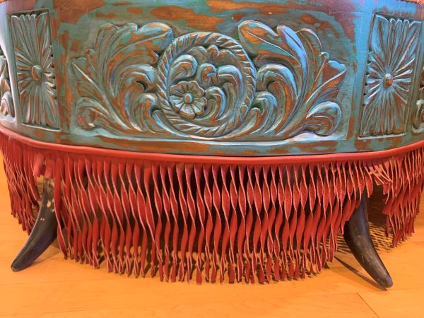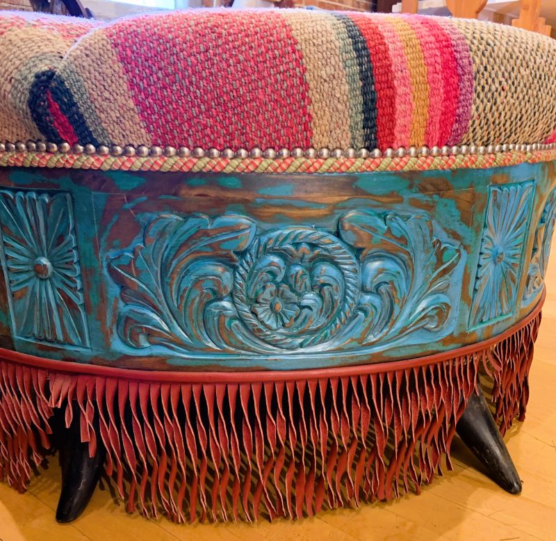 The padded seat cushion of this handcrafted ottoman is upholstered with multi-colored, fine fabric, and it is embellished with a centered, top, button tuft design. The junctions of the upholstery are double stitched, and the fabric is precision tacked to the solid wood frame with decorative silver nails. The sides of the base are adorned with alternating, carved, floral designs, and the entire lower base is enhanced with red leather fringe. This western style ottoman is supported by the best metal coils and springs, and it rest on inverted cow horn supports. It has a distressed turquoise finish, and it is 100% customizable.