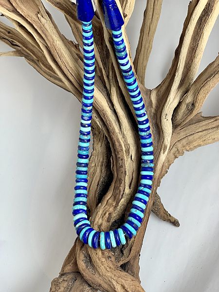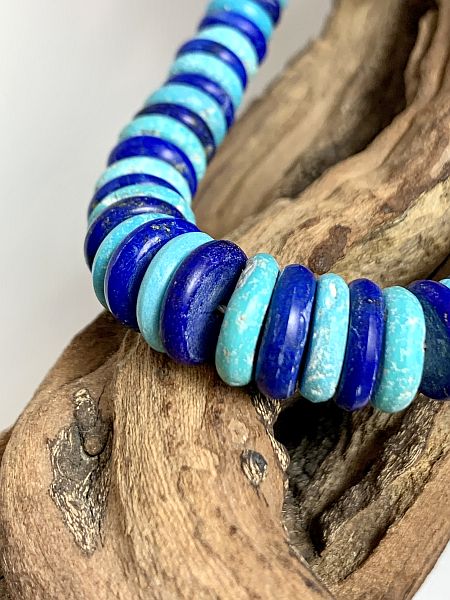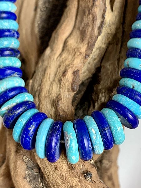 Alternating hand cut Morenci and lapis beads by master lapidary Bruce Eckhardt. The beads are 19” with hand cut (signature) lapis beads at each end.