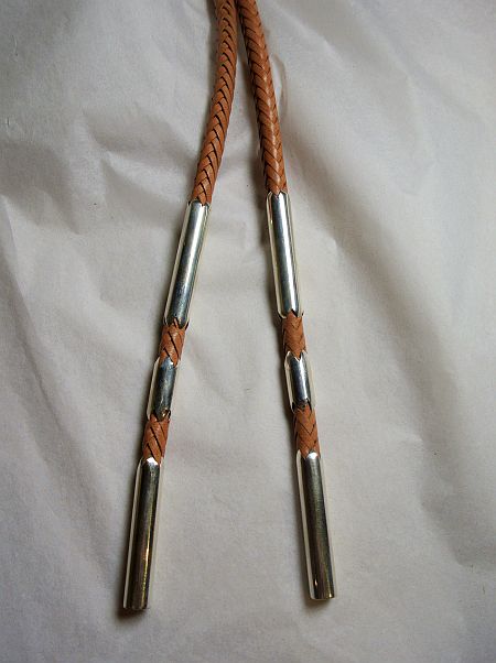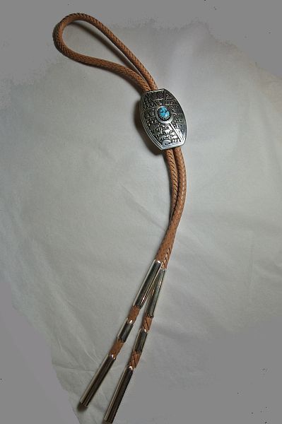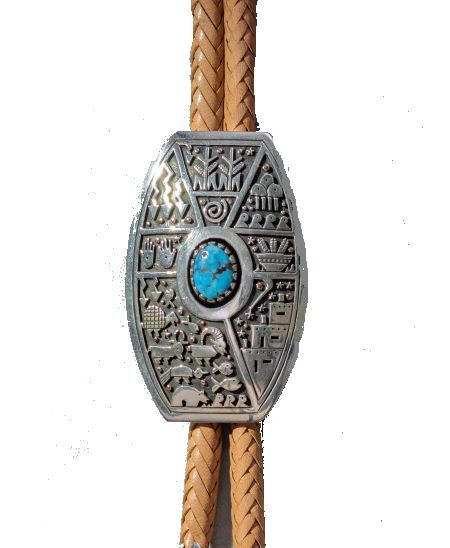 1516 Bolo by Santo Domingo artist Joseph Coriz. The 2” x 3” bolo has a pueblo scene, corn, harvest basket and animals. Eighteen karat gold dots are sprinkled throughout. A 3/8” x 1/2” Kingman cabochon is in the center, encased by a 14 karat gold bezel. The bolo is on 40” tan hand braided leather. Three piece sterling silver tips compliment the bolo.