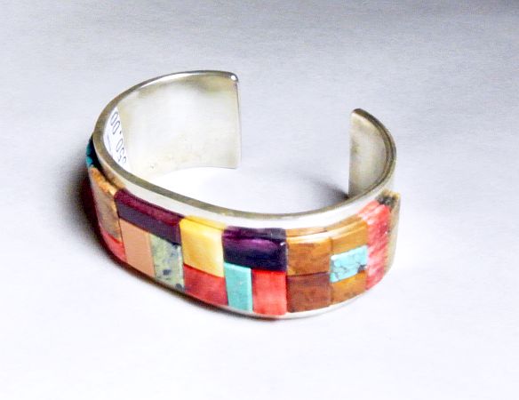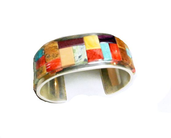 Sterling silver raised inlay cuff by master silversmith Tommy Jackson. The 1” cuff has serpentine, melon, jasper and turquoise inlay. The inside measurement is 5 1/4” with a 1” gap.