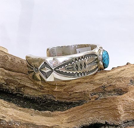 Heavy gauge sterling silver cuff by Navajo silversmith Jennifer Curtis. The 5/8” hand stamped cuff has a 3/8” x 1/2” Apache Turquoise stone. The inside is 5 1/4” with a 1 1/4” gap.