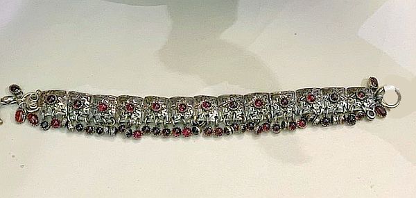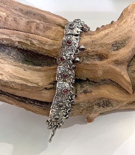 Sterling silver hand stamped link bracelet with garnet embellishments. The bracelet is made up of thirteen 1/2” x 1/2” hand stamped links, each with a garnet center and dangles. The 7” bracelet has a toggle closure.
