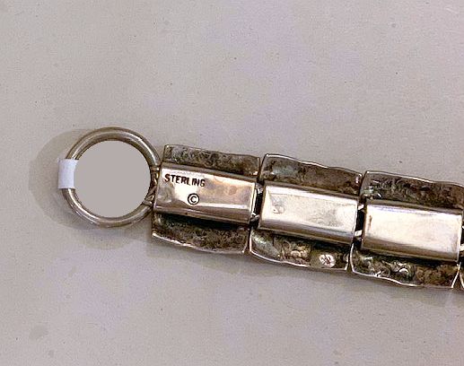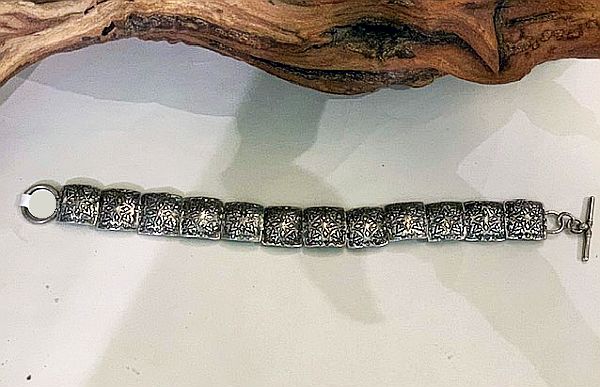 Sterling silver intricately hand stamped link bracelet. The bracelet is made up of eleven 5/8” x 5/8” hand stamped links. The 5/8” x 7 1/2” bracelet has a toggle closure.