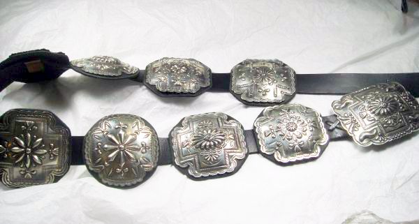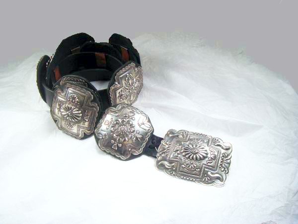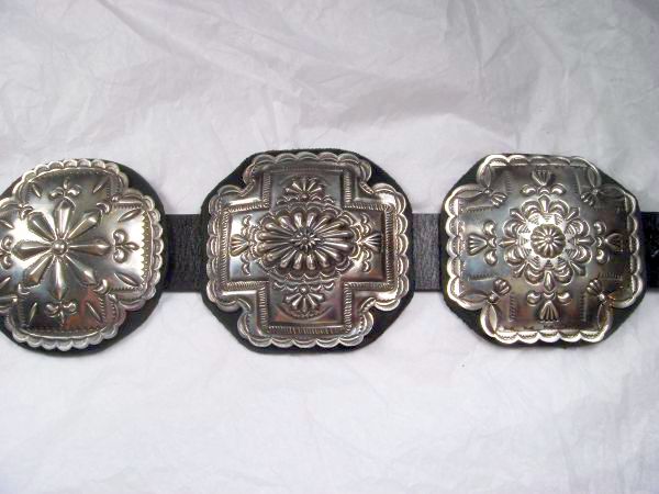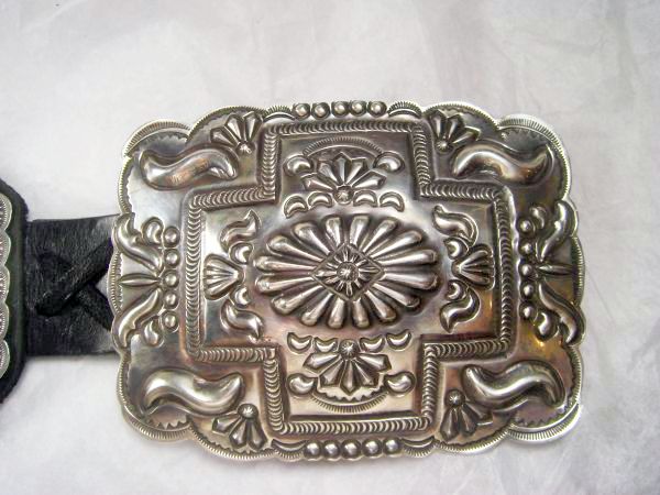 Classic old style sterling silver concho belt by Navajo silversmith Terry Charlie. The belt has nine 3 1/8” x 3 1/8” conchos, each with a different repousse and stamped pattern, and a buckle with repousse and stamp work. They are on a 1 ¼” black leather belt which can be made to any size.