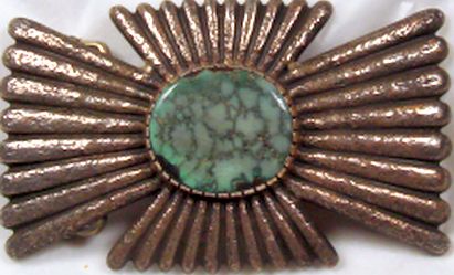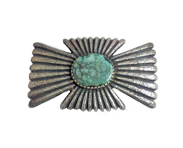 Tufa cast buckle by noted Navajo silversmith Fidel Bahe. The 3 ½” x 2” buckle has a 1” x 1” turquoise stone in the center.