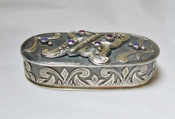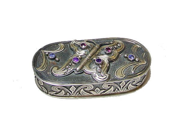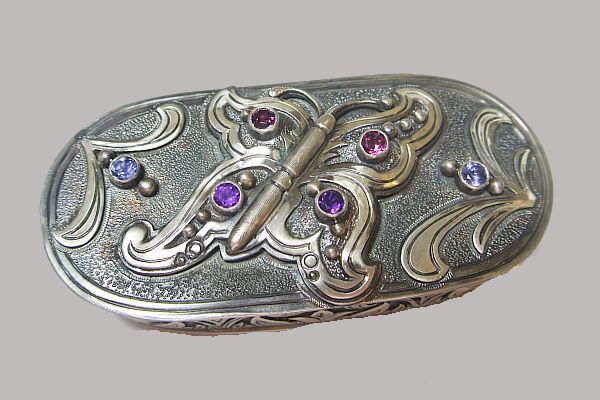 The 1 1/2 x 3 x 1 x 1 1/8 box has amethyst, topaz and red topaz embellishments. The underside has a butterfly etched in the silver.