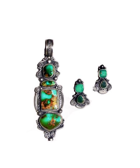 Sterling silver pendant and earrings by Navajo silversmiths Michael and Rosita Calladitto. The 1 3/8” x 4” pendant with a 3/4” bale is made up of three Royston turquoise which is encased in stamped, twisted wire and bead silverwork.