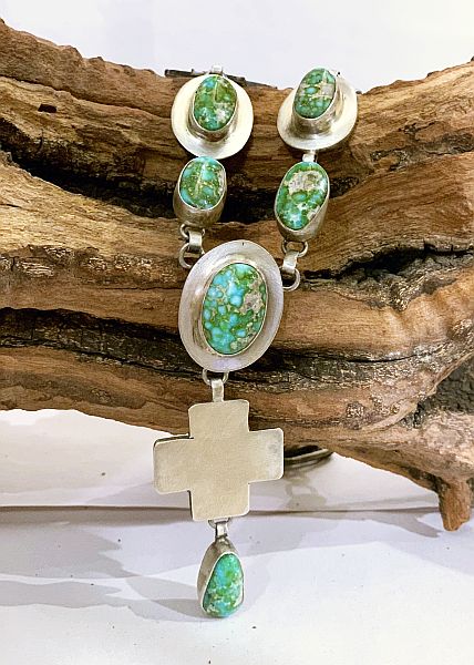 Sterling silver and Sonoran Gold Turquoise necklace by Navajo silversmith Randall Endito. The 19” necklace with ten Sonoran Gold turquoise and three silver crosses has a 3” drop.