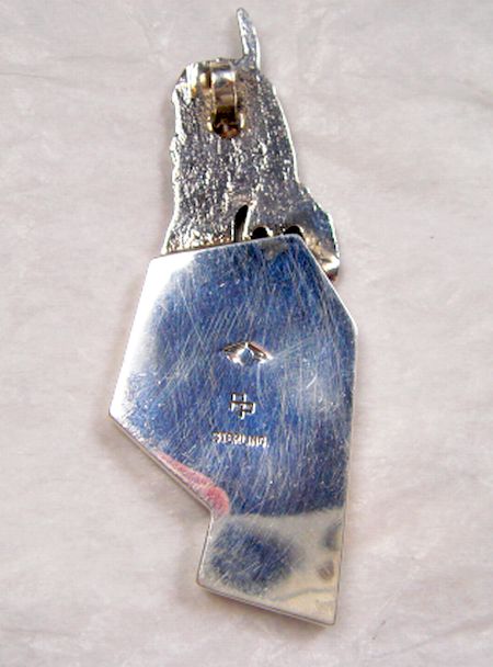 Sterling Silver pendant by Hopi silversmith Phil Poseyesva. The 1” x 2 1/2:” Longhair Kachina pendant has three types of Hopi silverwork.  The head is tufa cast, the body traditional Hopi overlay and inlay. The inlay is Orange Spiney Oyster, Yellow Spiney Oyster and Turquoise. “PP” is stamped on the back (the hallmark of Phil Poseyesva) along with the Bischoff’s Shades of the West hallmark.