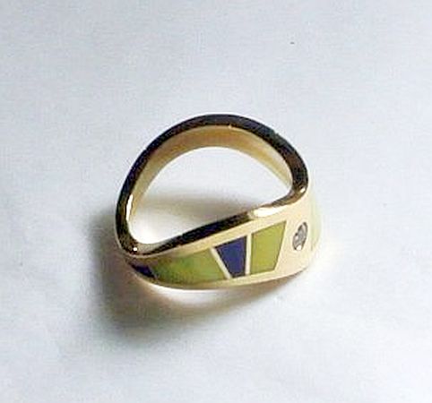 Orvil Jack and Sugalite inlay ring by Arizona silver and goldsmith Tim Busch. The 14 K gold ring has a .18 CTW diamond accent stone.