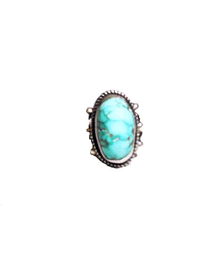 Sterling silver ring by Navajo silversmith Albert Jake. The three wire ring has a 1/2” x 3/4” Royston turquoise cabochon which was cut and polished by Bruce Eckhardt, Arizona lapidary. Size: 7.5