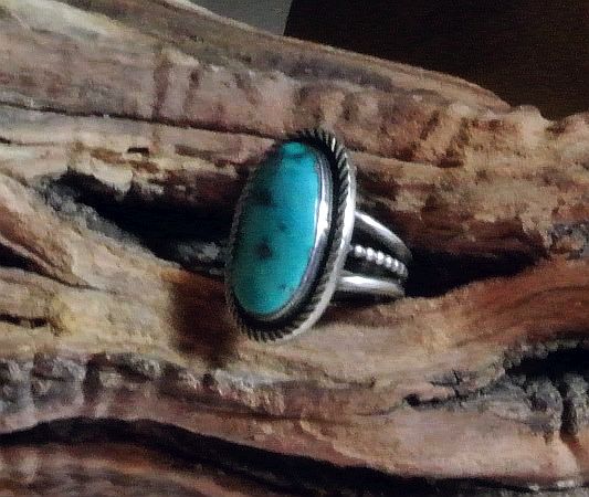 Sterling silver ring by Navajo silversmith Calvin Martinez. Morenci turquoise is set in a flat bezel, edged with a rope design. The Morenci cabochon is 1/2” x 1”. Size: 11 1/2